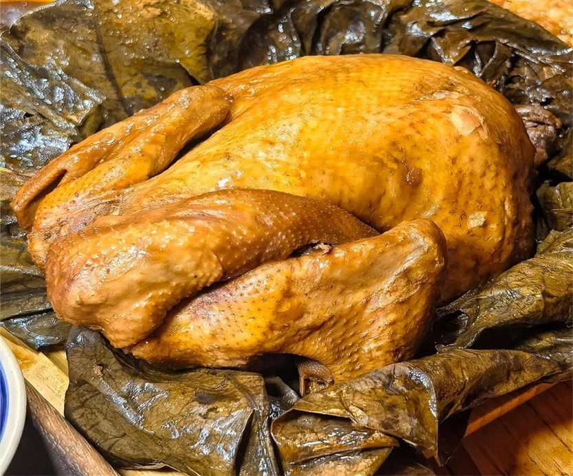 Beggar Chicken, also called “Wealth Chicken”, is a Hangzhou classic. Legend says a beggar invented it by mud-baking a stolen chicken. Now we stuff tender chicken with herbs, wrap it in lotus leaves and clay, then slow-roast it. Cracking open the clay releases an aromatic steam, revealing fall-off-the-bone tender meat – a true culinary legend.
